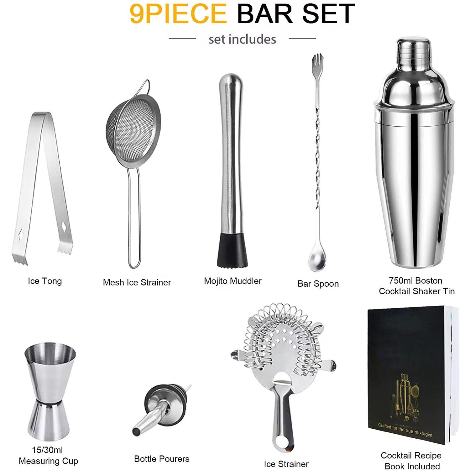 For the Entertainer: 750ml 9-piece stainless steel cocktail set with shaker